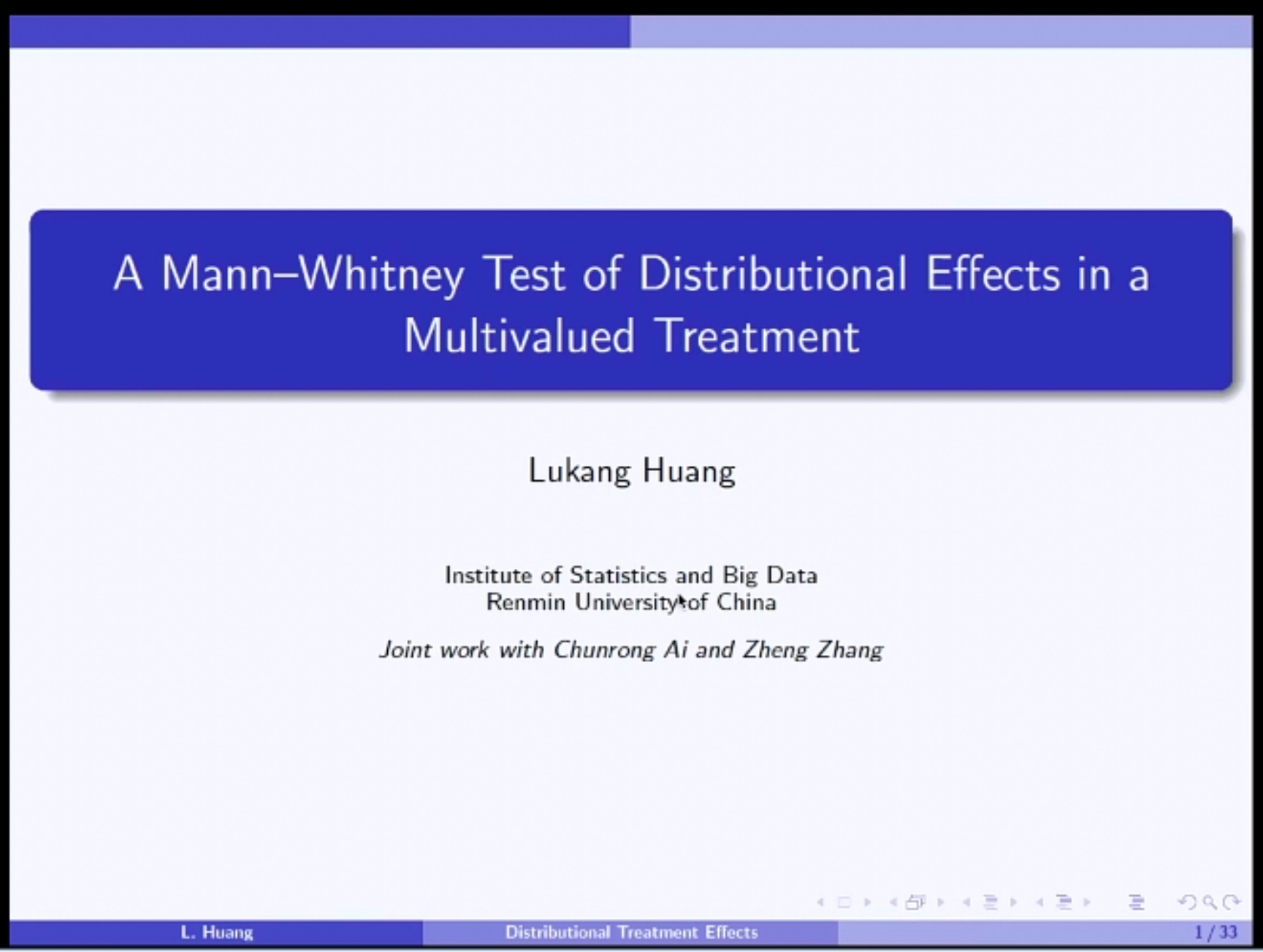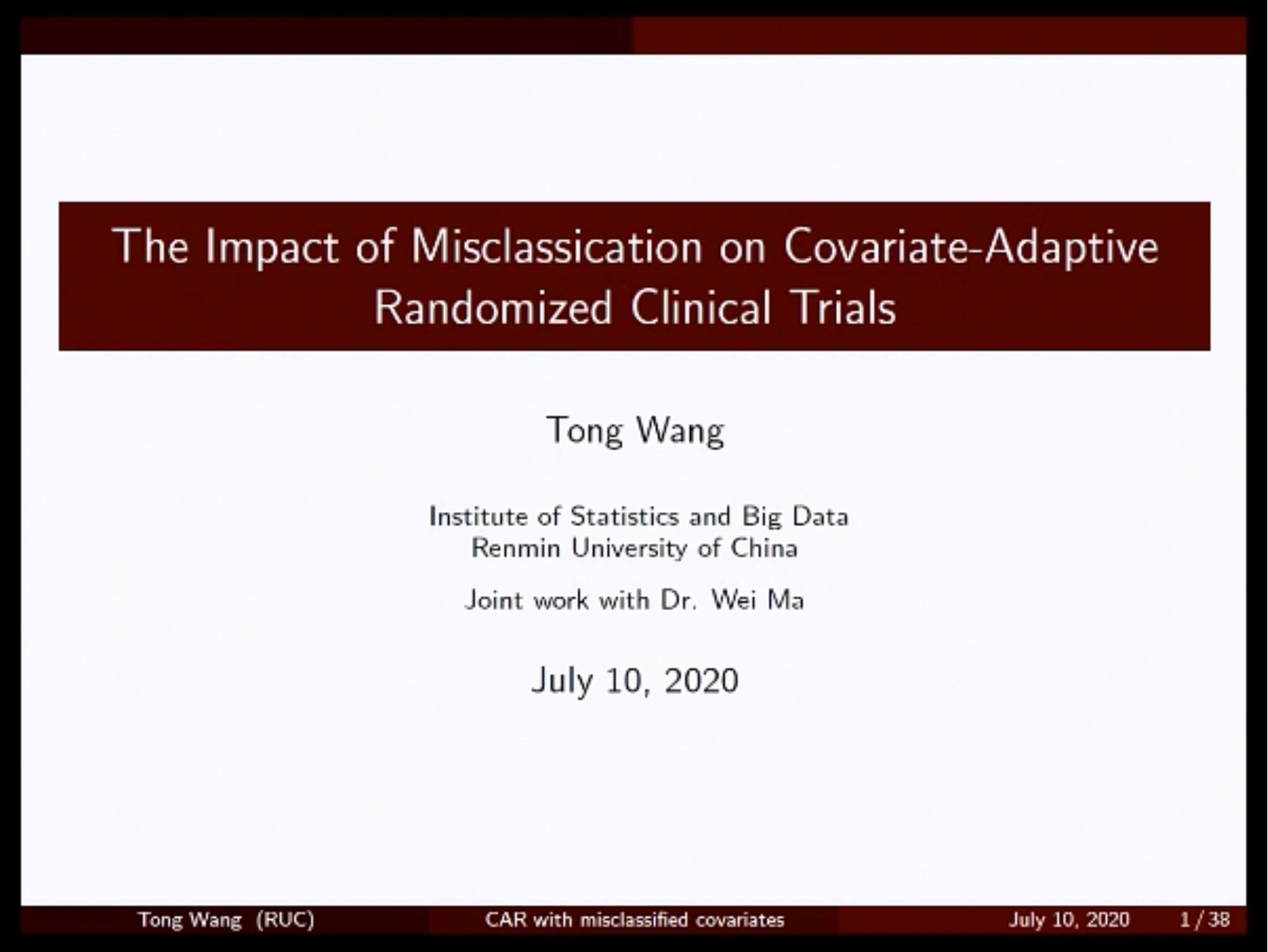 2020年7月10日上午,我院2016级博士研究生黄露康、王通分别以“A Mann–Whitney test of distributional effects in a multivalued treatment”、“The Impact of Misclassication on Covariate-Adaptive Randomized Clinical Trials”为主题在线进行了学术报告。