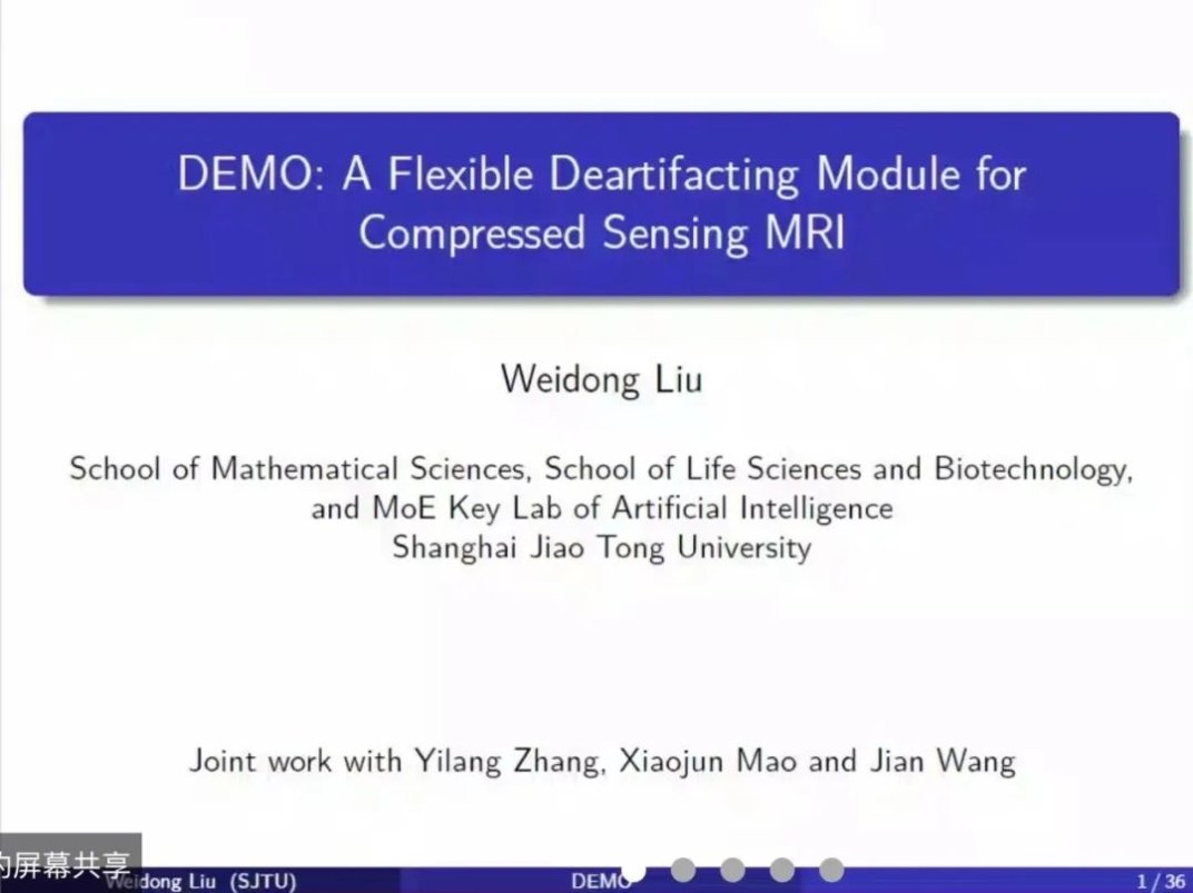 下午13:30-14:30,上海交通大学特聘教授刘卫东线上进行了主题为“A Flexible Deartifacting Module for Compressed Sensing MRI”的讲座。