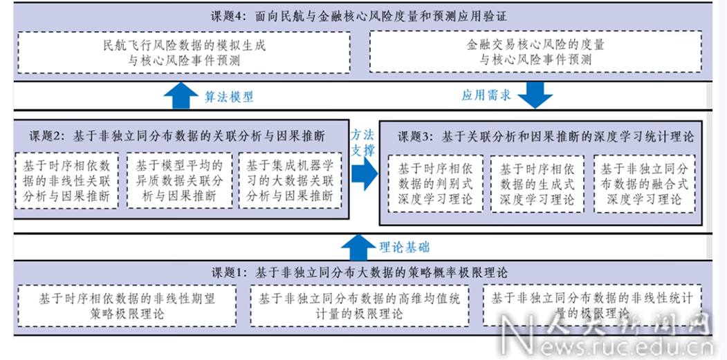 “非独立同分布大数据统计基础理论、方法与应用”项目由最新吃瓜 牵头,山东大学、华东师范大学、北京师范大学、中国科学院数学与系统科学研究院、西安交通大学等单位共同承担。项目将在大规模、高维度和非线性大数据统计学基础上,针对相依性和异质性等特点,构建非独立同分布大数据统计学基础理论与方法,形成以策略概率极限理论、高维均值和非线性统计量极限理论为基础理论,以关联分析和因果推断、模型平均和集成学习为基本方法,以有监督、自监督和融合式深度学习为核心算法,以民航和金融核心风险度量与预测为典型应用的“理论-方法-算法-应用”四位一体的研究新范式。