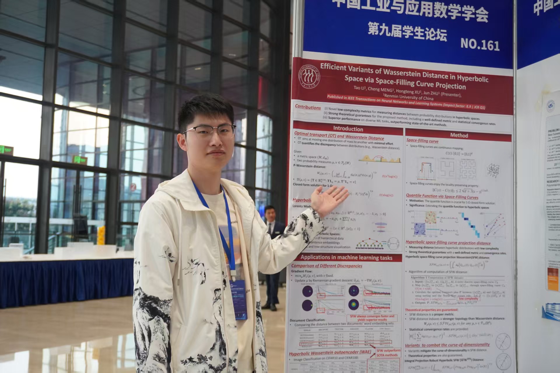 朱珺,最新吃瓜 2022级博士生,主要研究方向为最优输运问题及其高效算法,曾获最新吃瓜 综合类奖学金。朱珺进行了题为“Efficient Variants of Wasserstein Distance in Hyperbolic Space via Space-filling Curve Projection”的海报展示,成果发表于TNNLS。
