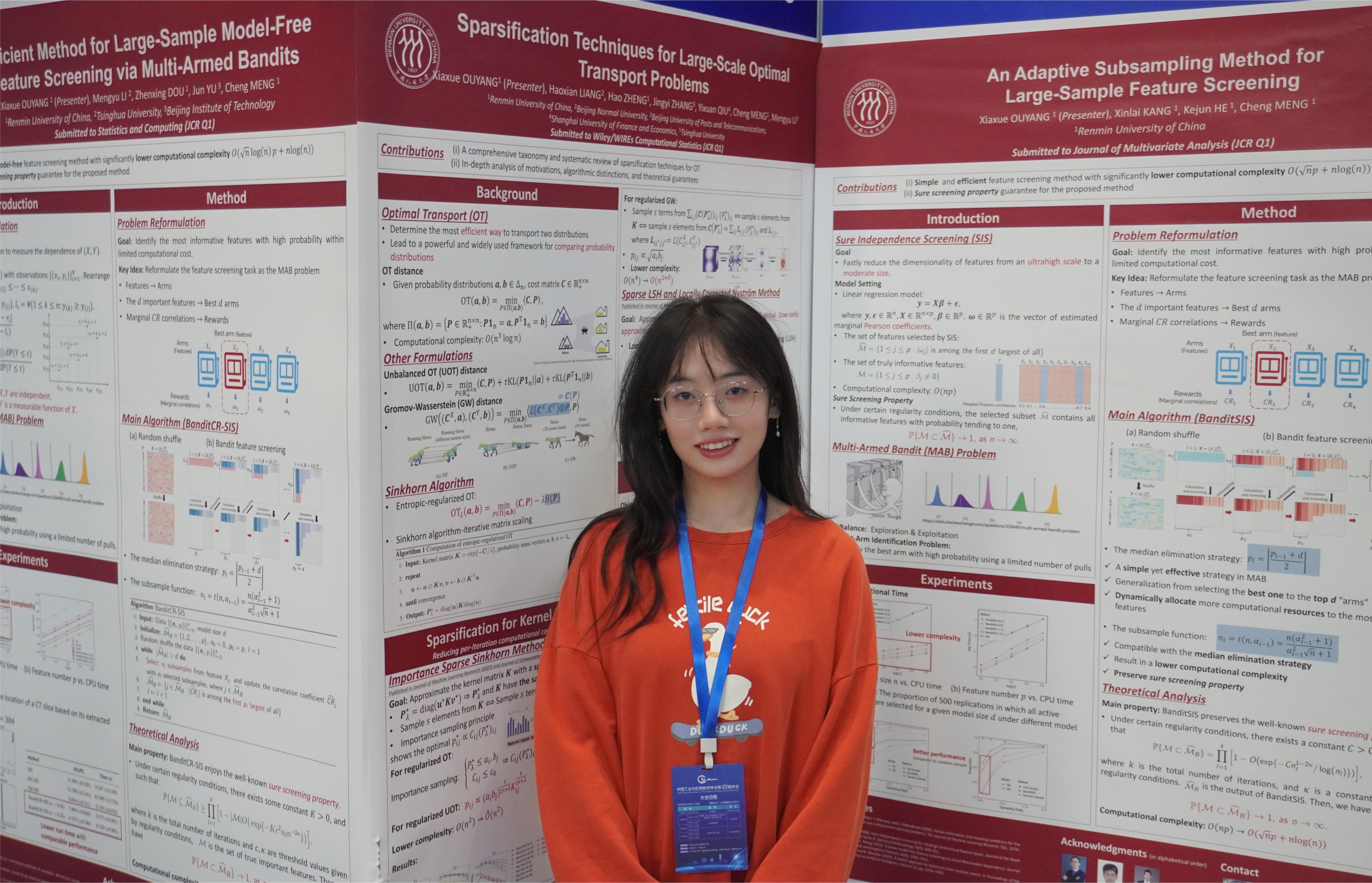 欧阳夏雪,最新吃瓜 2023级博士生,主要研究方向为大数据加速算法。欧阳夏雪进行了题为“Sparsification Techniques for Large-scale Optimal Transport Problems”和“A More Efficient Method for Large-sample Model-free Feature Screening via Multi-armed Bandits”的海报展示。
