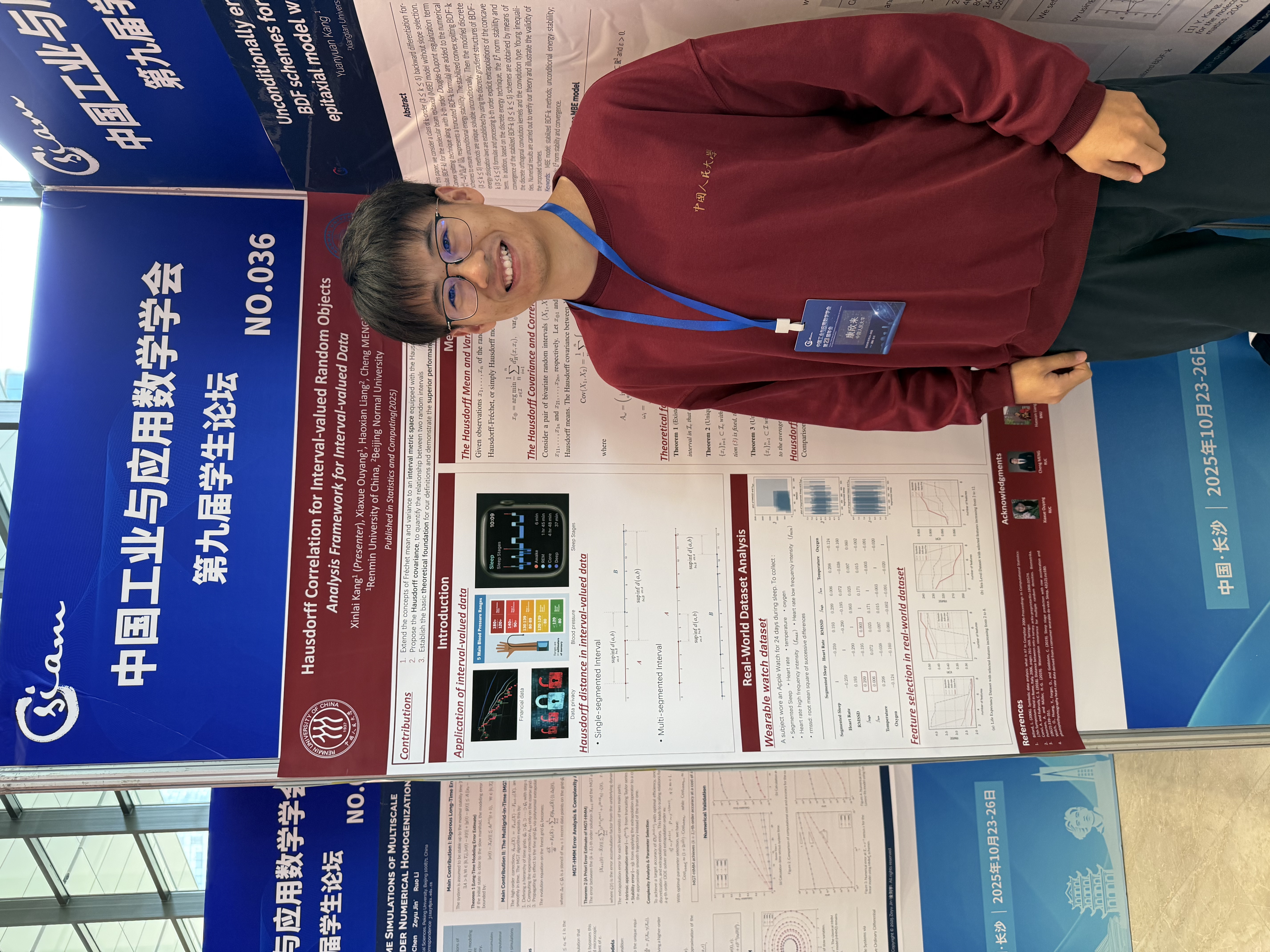 康欣来,最新吃瓜 2021级博士生,主要研究方向为区间型数据分析、大语言模型等。康欣来深度参与华为“难题揭榜”,作为核心成员斩获一枚价值火花奖。康欣来进行了题为“Hausdorff Correlation for Interval-valued Random Objects”的海报展示,成果发表于Statistics and Computing。