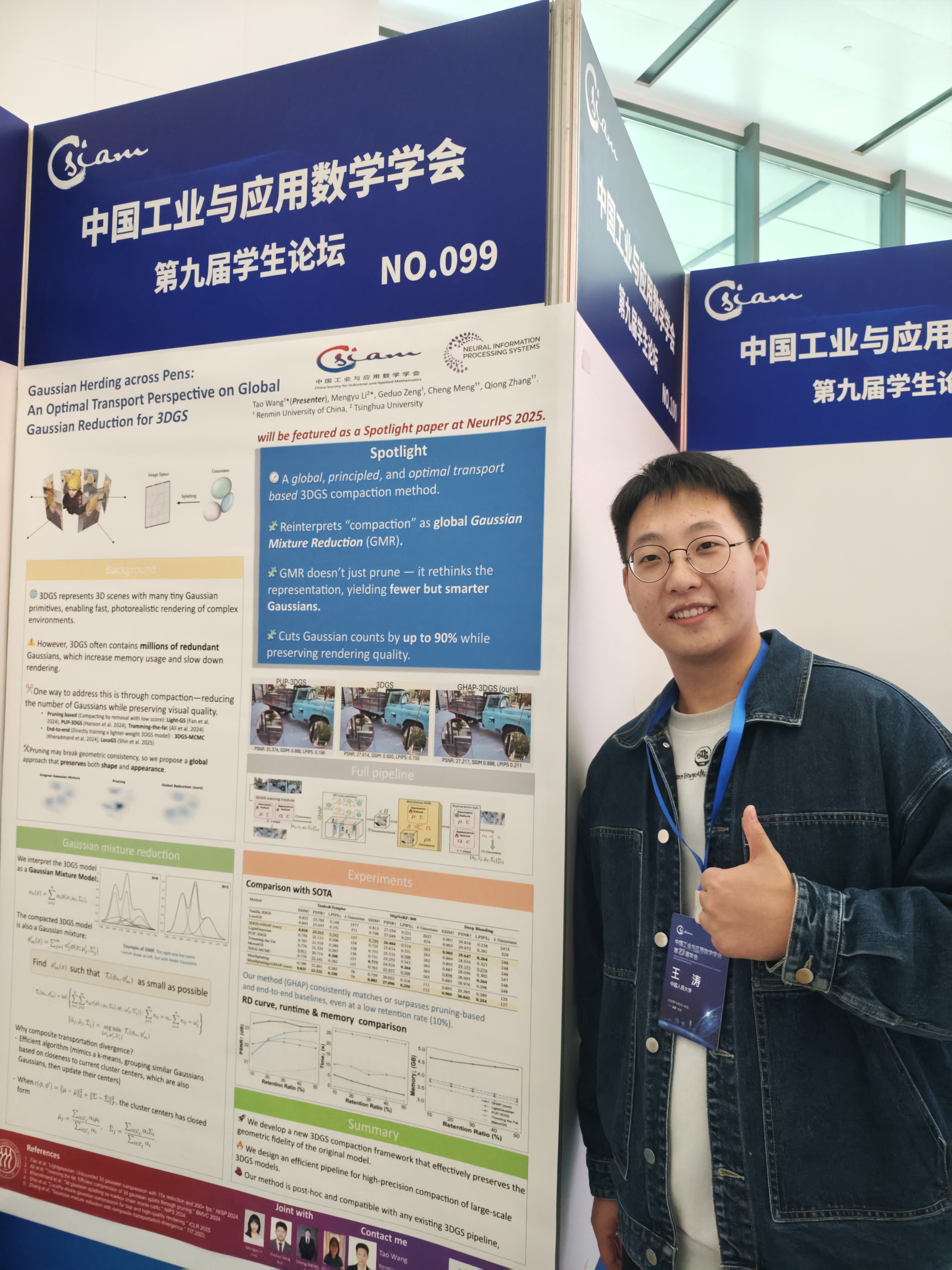 王涛,最新吃瓜 2023级博士生,研究方向为最优输运、非参数统计、机器学习。王涛深度参与华为“难题揭榜”,作为核心成员斩获一枚价值火花奖。王涛进行了题为“Gaussian Herding across Pens: an Optimal Transport Perspective on Global Gaussian Reduction for 3DGS”的海报展示,成果发表于NeurIPS(Spotlight).