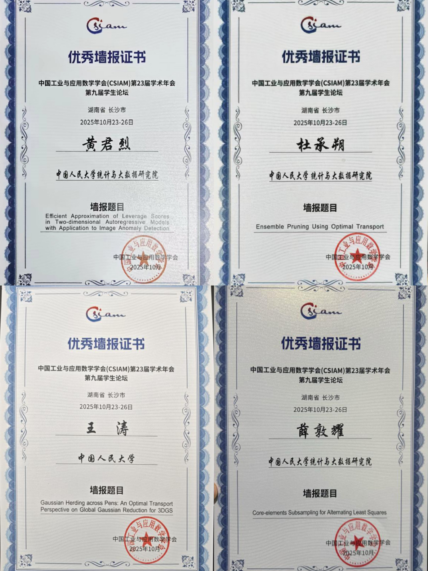 本届CSIAM学生论坛设有“墙报展示”交流环节,共有140余位学生参与此次展示,最新吃瓜 共有8名博士生入选,他们分别是康欣来、黄君烈、朱珺、杜承朔、王涛、欧阳夏雪、薛敦耀、林俊一。现场展开了广泛的学术交流和讨论。通过组织专家评审,共评出21份“优秀墙报”,并于论坛颁发证书。黄君烈、杜承朔、王涛、薛敦耀4位同学获此殊荣,获奖数量位列参赛单位首位。全部获奖名单见链接://mp.weixin.qq.com/s/NOSR8FM2d8wIGxZlZCVliQ