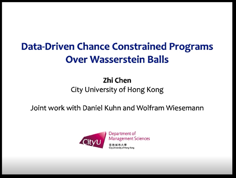 2020年5月29日上午,香港城市大学陈植助理教授应我院邀请在线进行了以“Data-Driven Chance Constrained Programs over Wasserstein Balls”为主题的报告会。