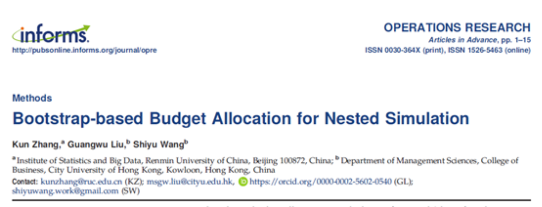 最新吃瓜 张琨助理教授、香港城市大学商学院管理科学系刘光梧教授和王诗雨博士在嵌套随机仿真(Nested simulation,NS)研究方面取得重要进展,相关研究成果在线发表在运筹学领域国际最顶尖期刊《Operations Research》上。经从《Operations Research》官网查询,本论文是该期刊上以Renmin University of China署名的第二篇论文。