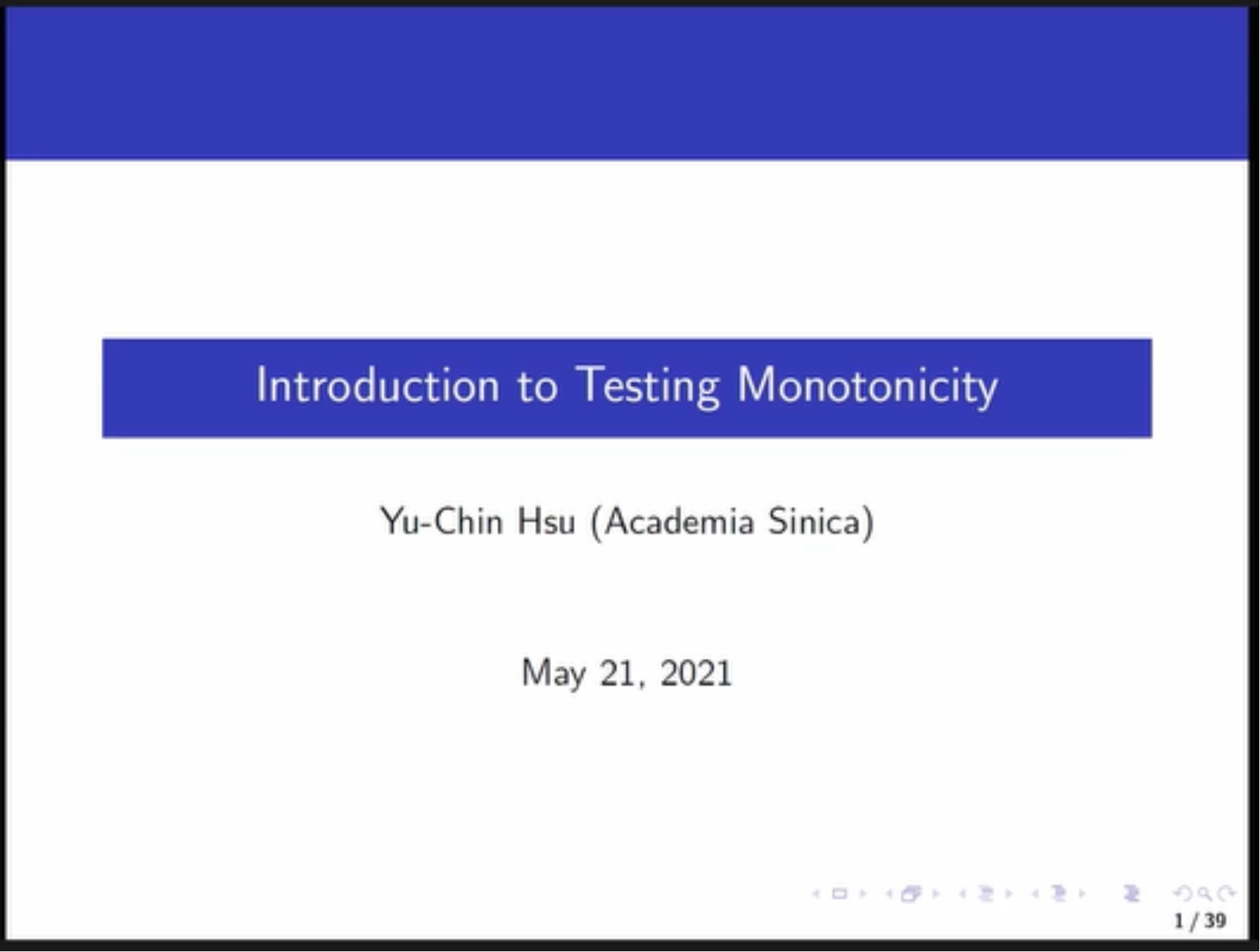 2021年5月21日上午,Academia Sinica许育进研究员应我院邀请在线进行了以 “Introduction to Testing Monotonicity”为主题的学术报告。