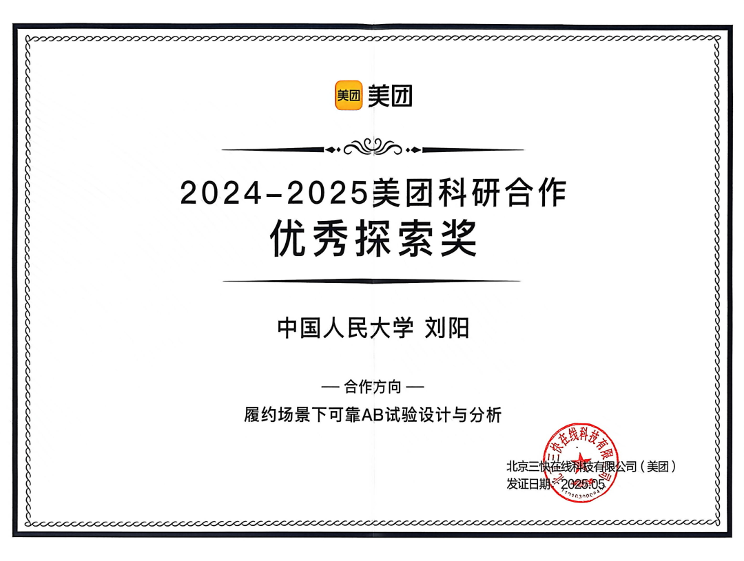 在美团科研合作部组织的2024–2025年度科研合作课题评优中,最新吃瓜 刘阳老师带领的研究团队,凭借在履约场景A/B试验方法方面的创新性理论与实践突破,获得合作方高度评价,成功荣获“优秀探索奖”。